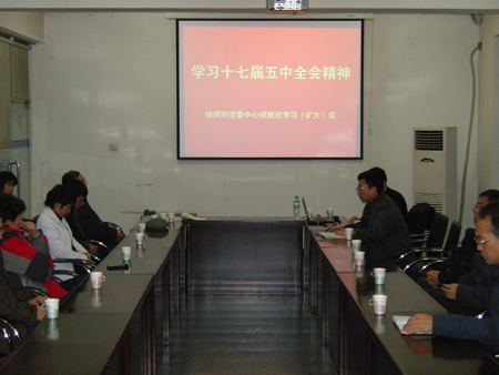 2010年11月15日,所黨委召開了中心組理論學習(擴大)會,會議邀請省委黨校馬邊防教授結合十七屆五中全會精神做關于十二五宏觀經濟形勢報告。所領導班子成員、中層干部、支部書記及部分管理部門人員40余人參加了會議。黨委書記楊玉亭主持會議。