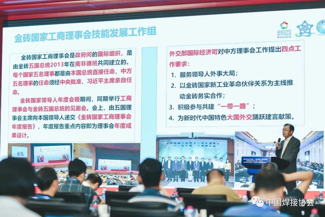 北京嘉克新興科技有限公司董事長劉振英博士做題為《深化金磚國家人才培養成果與展望》的報告。報告從金磚大賽的發展歷程,主辦承辦的各類賽事,推進國家技能訓練基地建設、實施“技能護照”計劃、舉辦技能發展與技術創新系列大講堂、成立未來技能發展與技術創新研究院、緊密與國際組織合作等幾個方面進行了詳細的介紹,這些工作扎實有效的提高了我國焊接事業在國際舞臺的影響力與話語權。