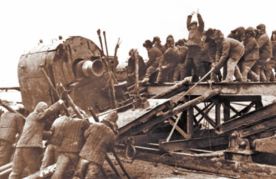 大會戰(zhàn)時(shí)期,王進(jìn)喜(中)和鉆井工人們?nèi)死缈高\(yùn)鉆機(jī),保障鉆井作業(yè)。(資料圖片)
